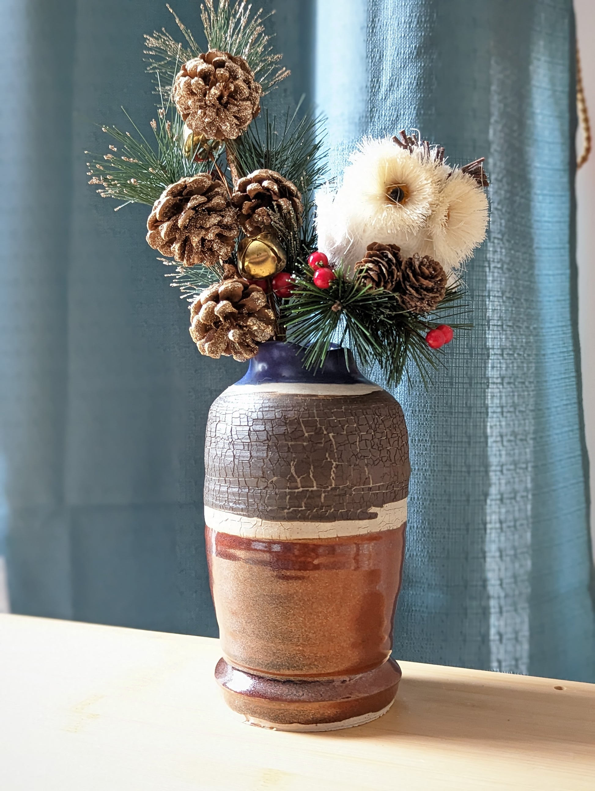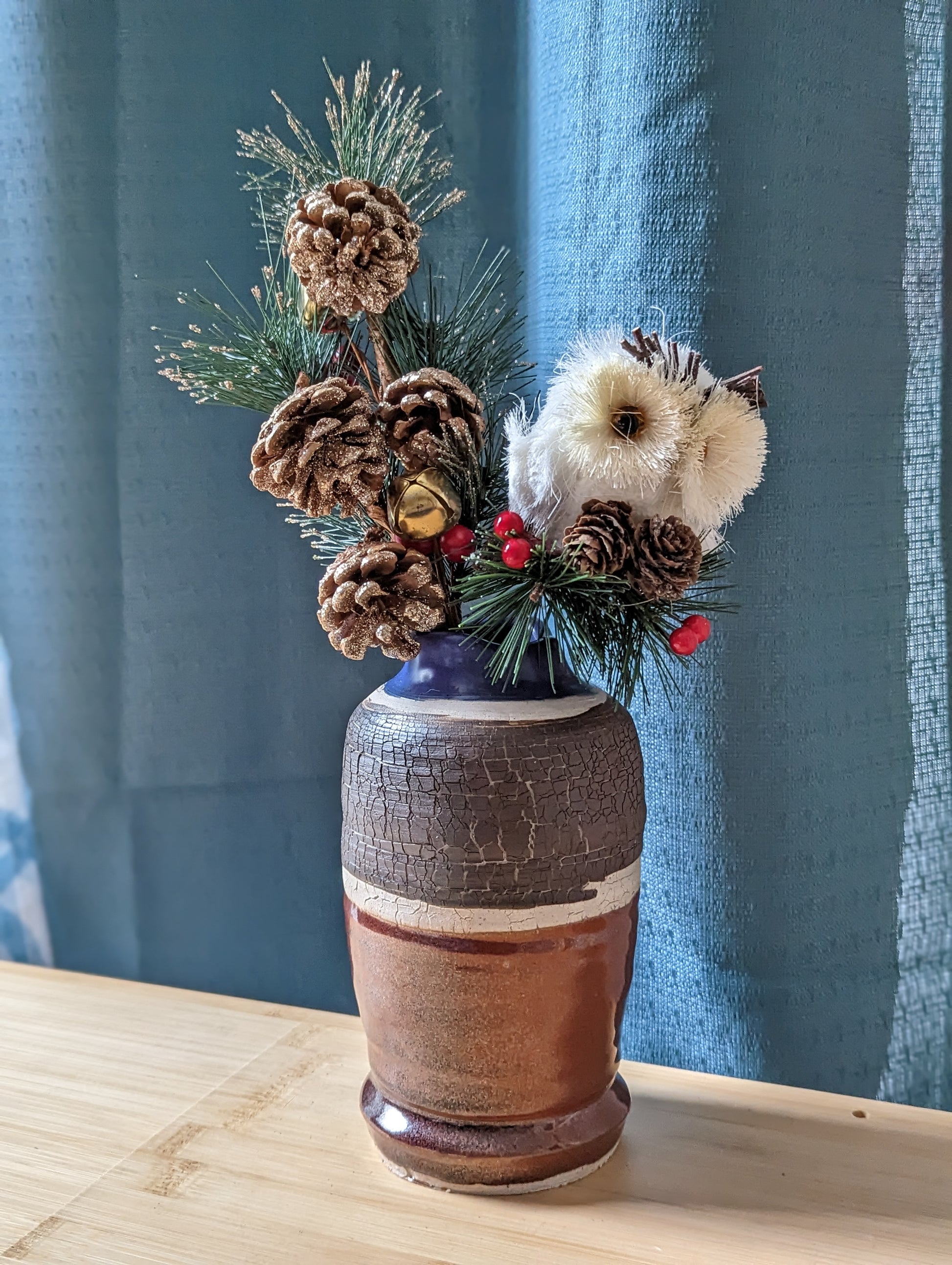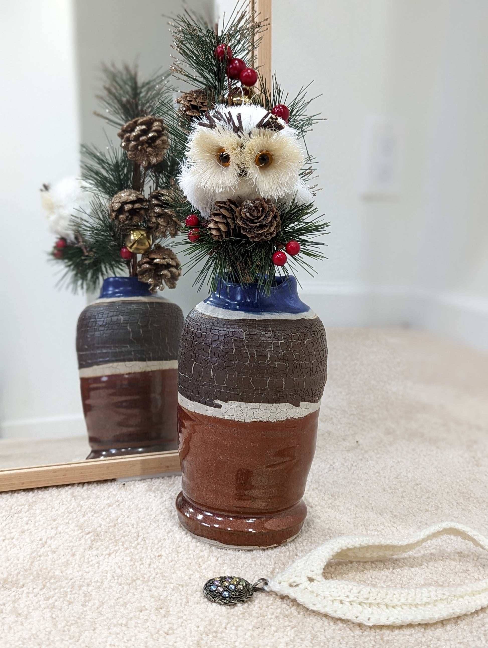 Accessory: Seasonal décor with jingle bells, pine cones, faux cranberries and a cute little white owl (symbolizing wisdom, intuition, independent thinking, and observant listening)