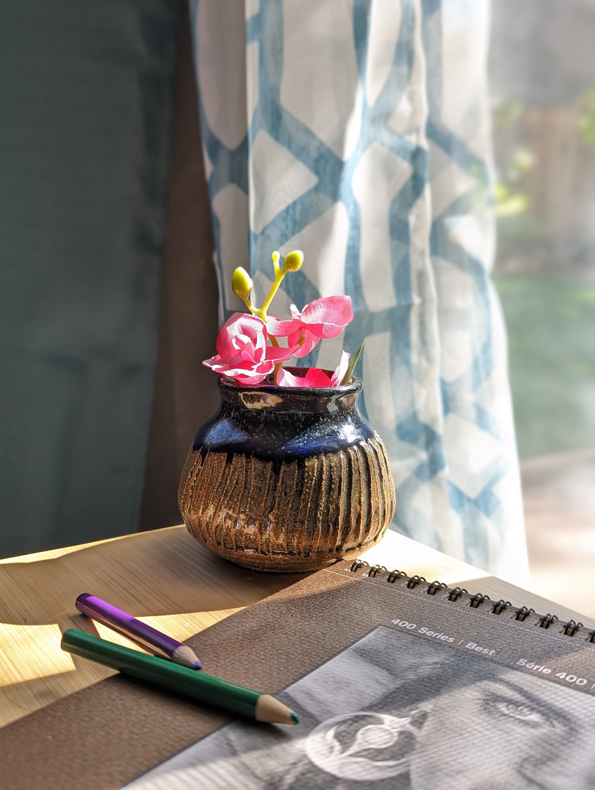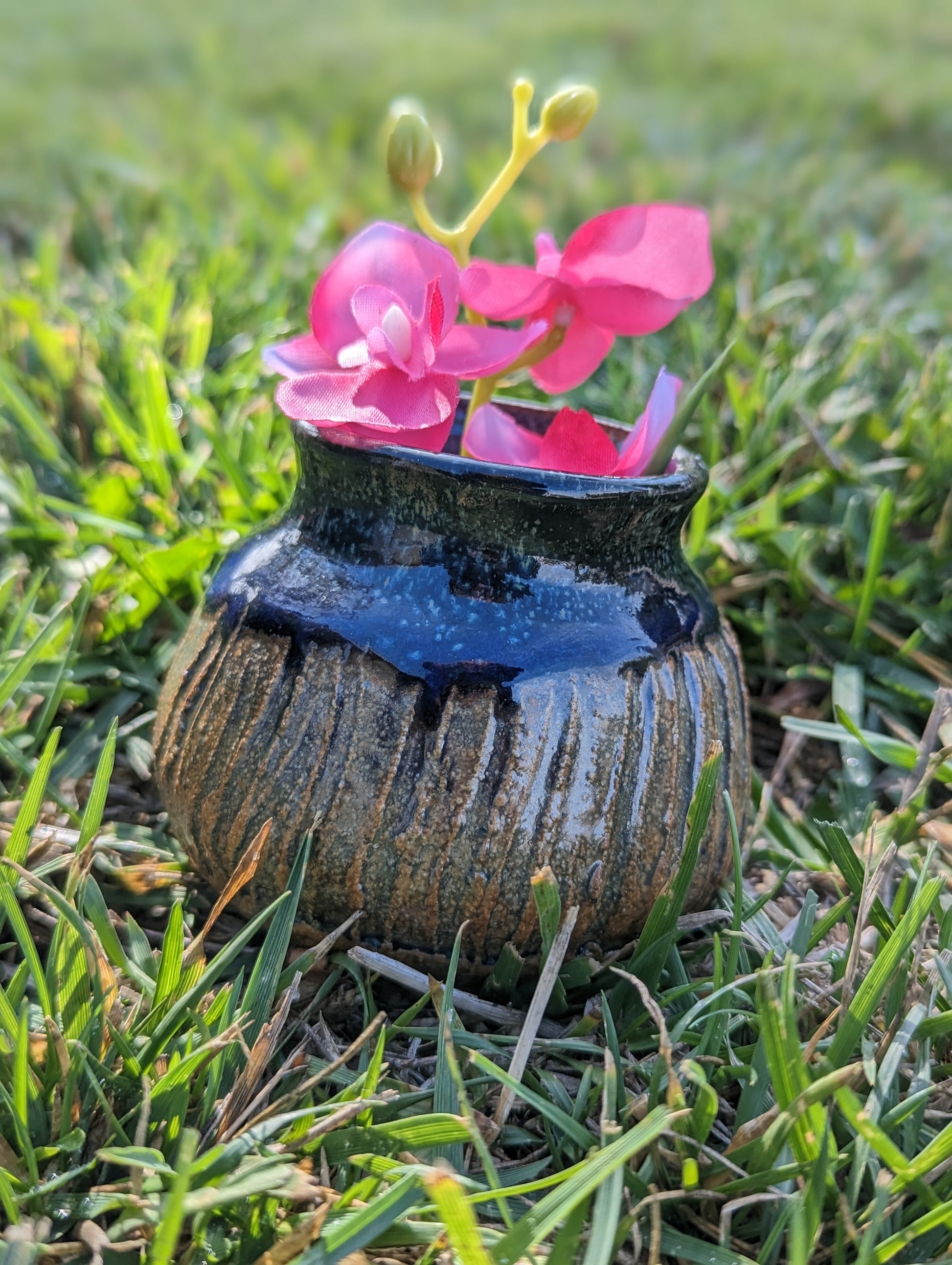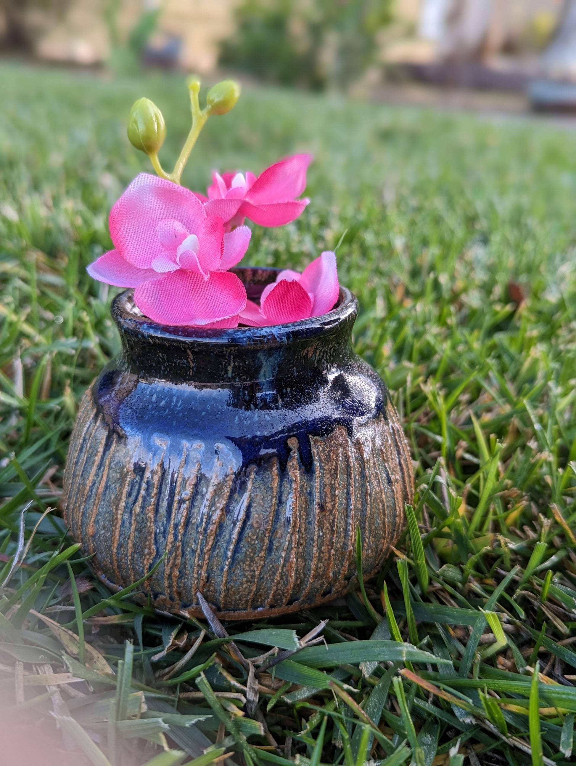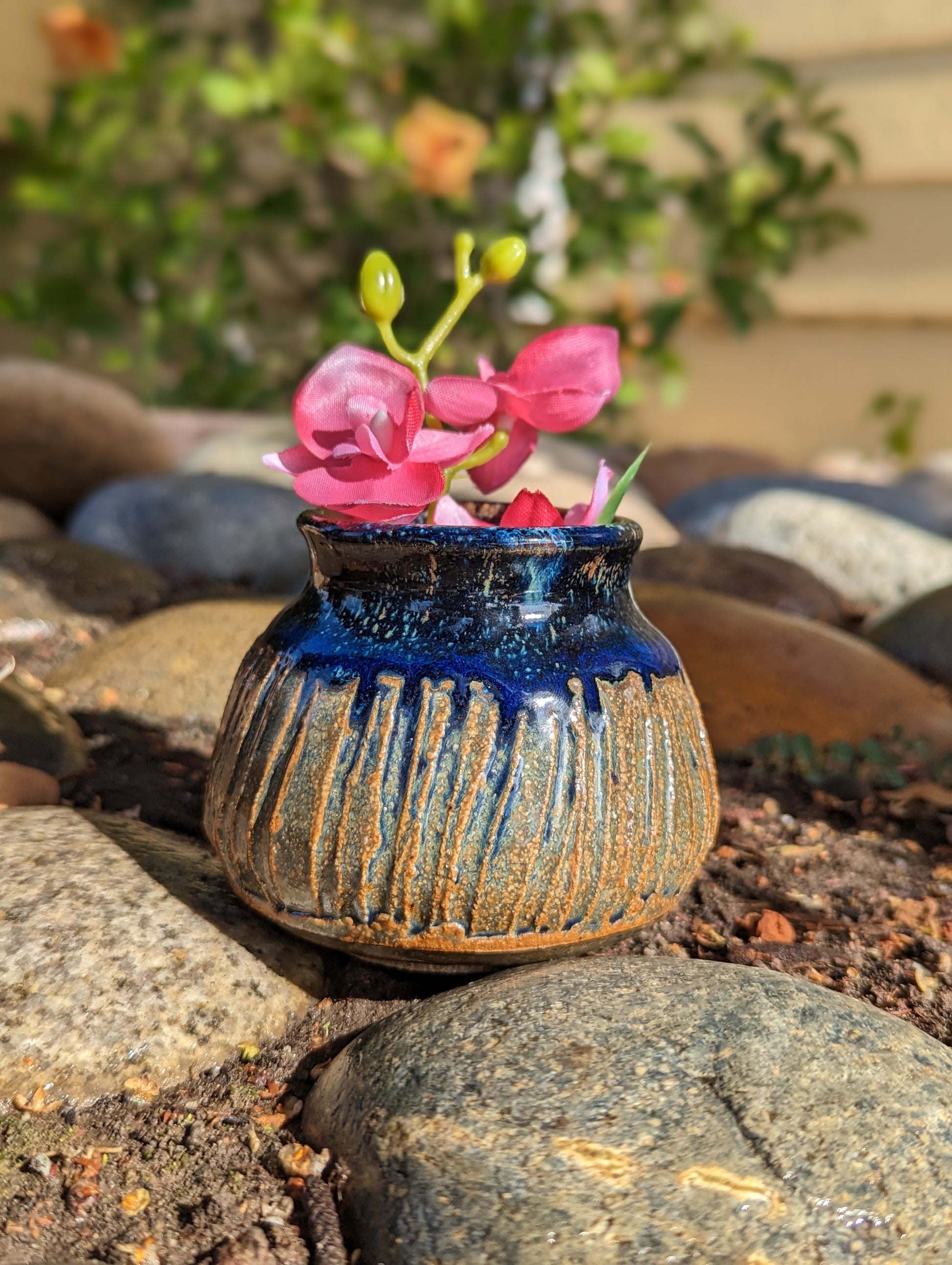 Hand carved stripes incorporated into this rustic bud vase with fizzy flow of Navy glaze on the top. Suited for display in office spaces and personal workstations. Small but mighty décor is great as a gift for your near and dear this holiday season.