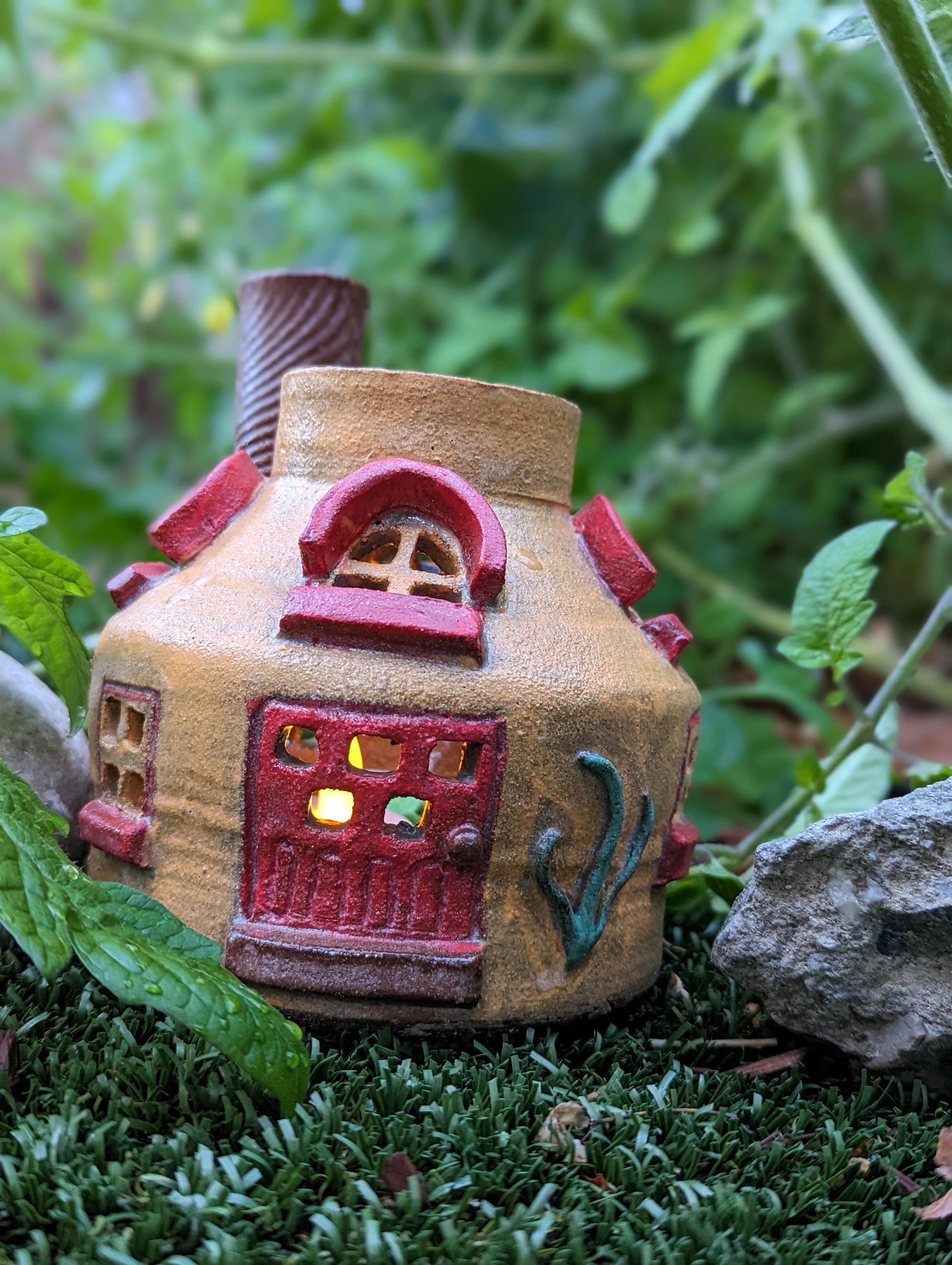 In the color of the yellow sun with a bold red accent, this chimneyed tea light hobbit house, a perfect fit in your garden with the lush green foliage. This could also be used as an incense holder by placing it in the chimney of the hobbit house. The small windows emits the hues of light illuminating the space around leaving one with a warm feeling within.