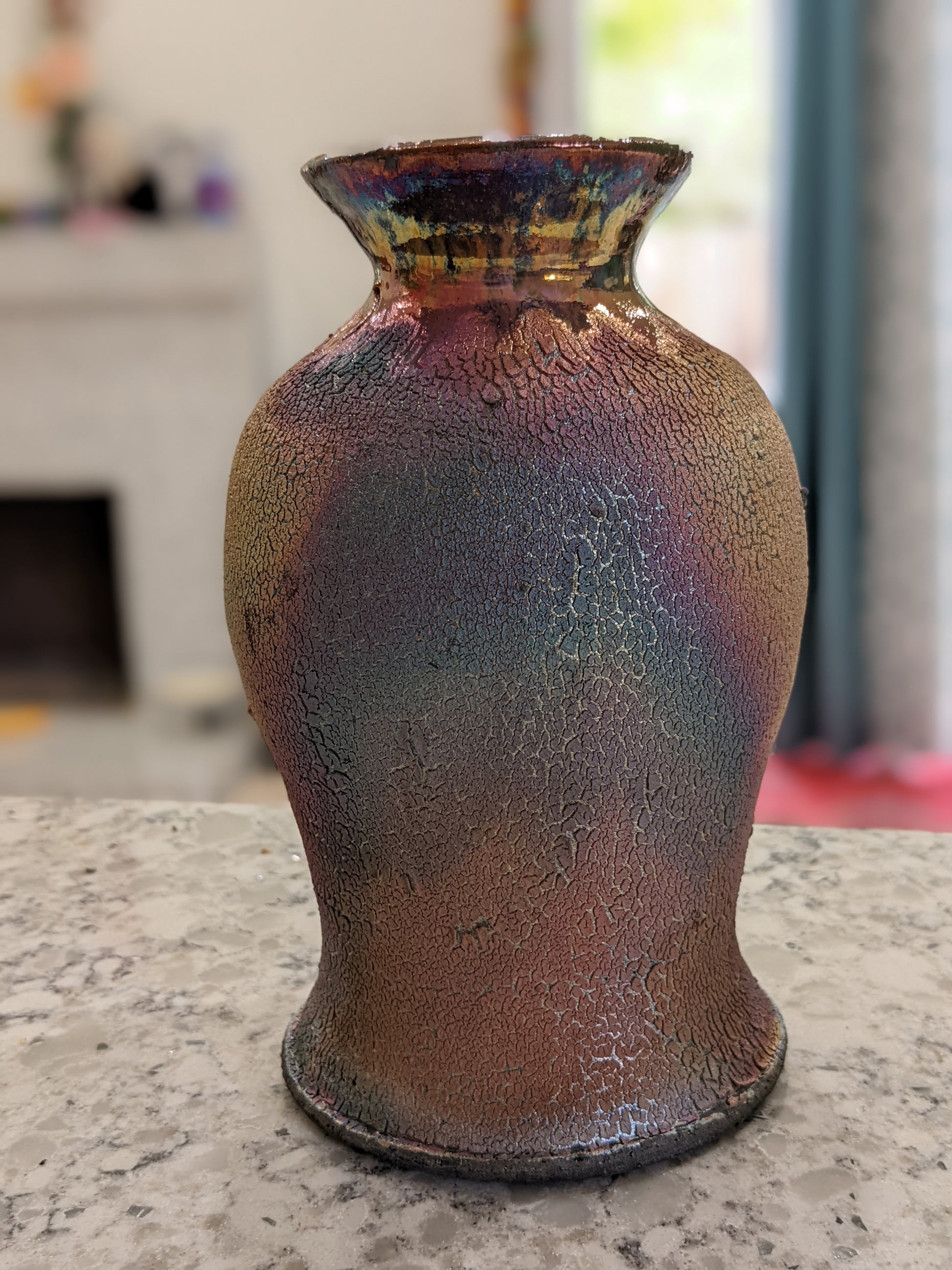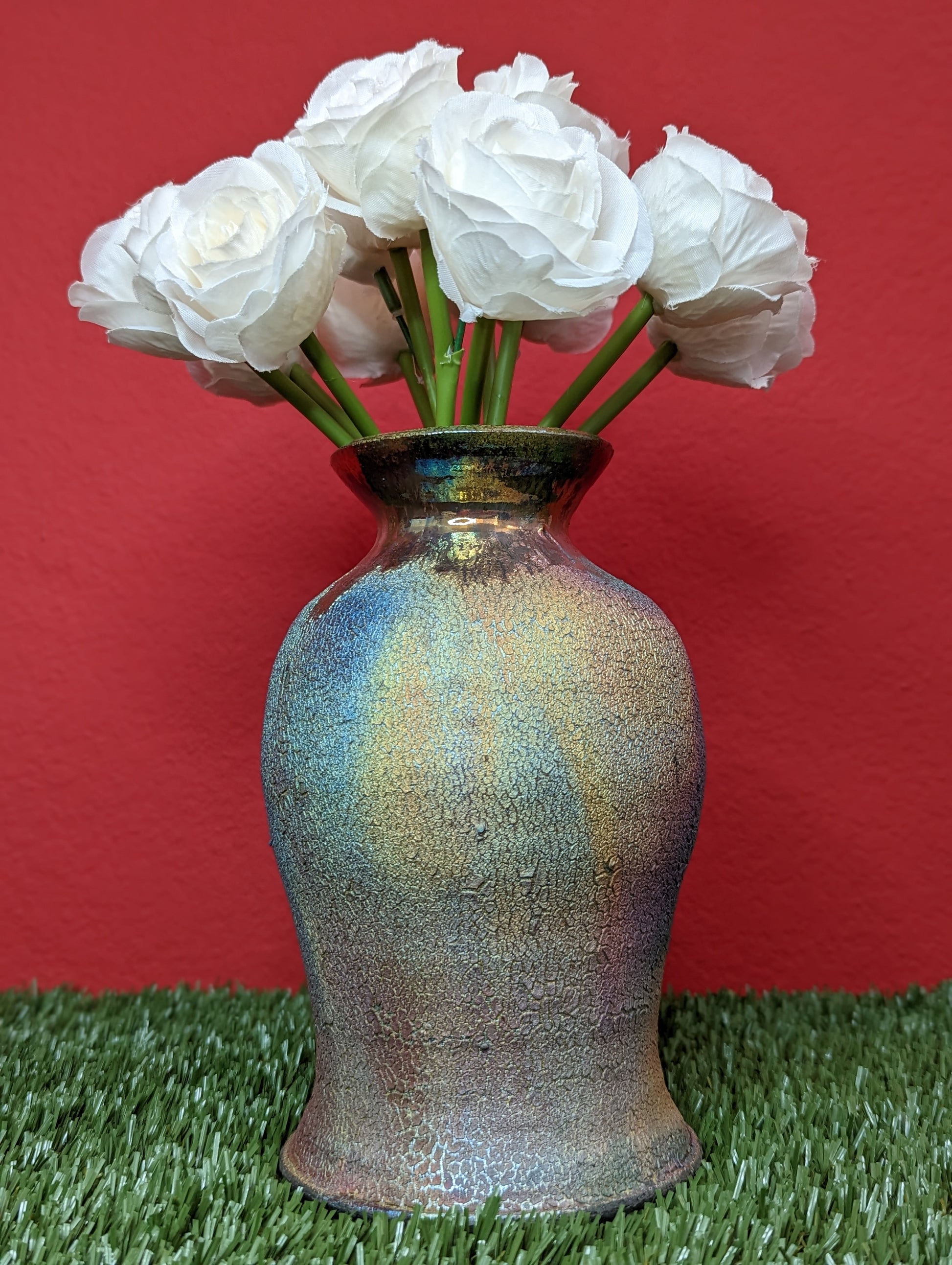 Hand crafted using the Japanese Raku technique this vase captures the colors of nature beautifully. It delivers big, bold rainbow like appeal to any space. It is complemented with copper luster in its neck and mouth to ramp up its elegance. The shape of the vase is edged with curves and inspired by an amphora.