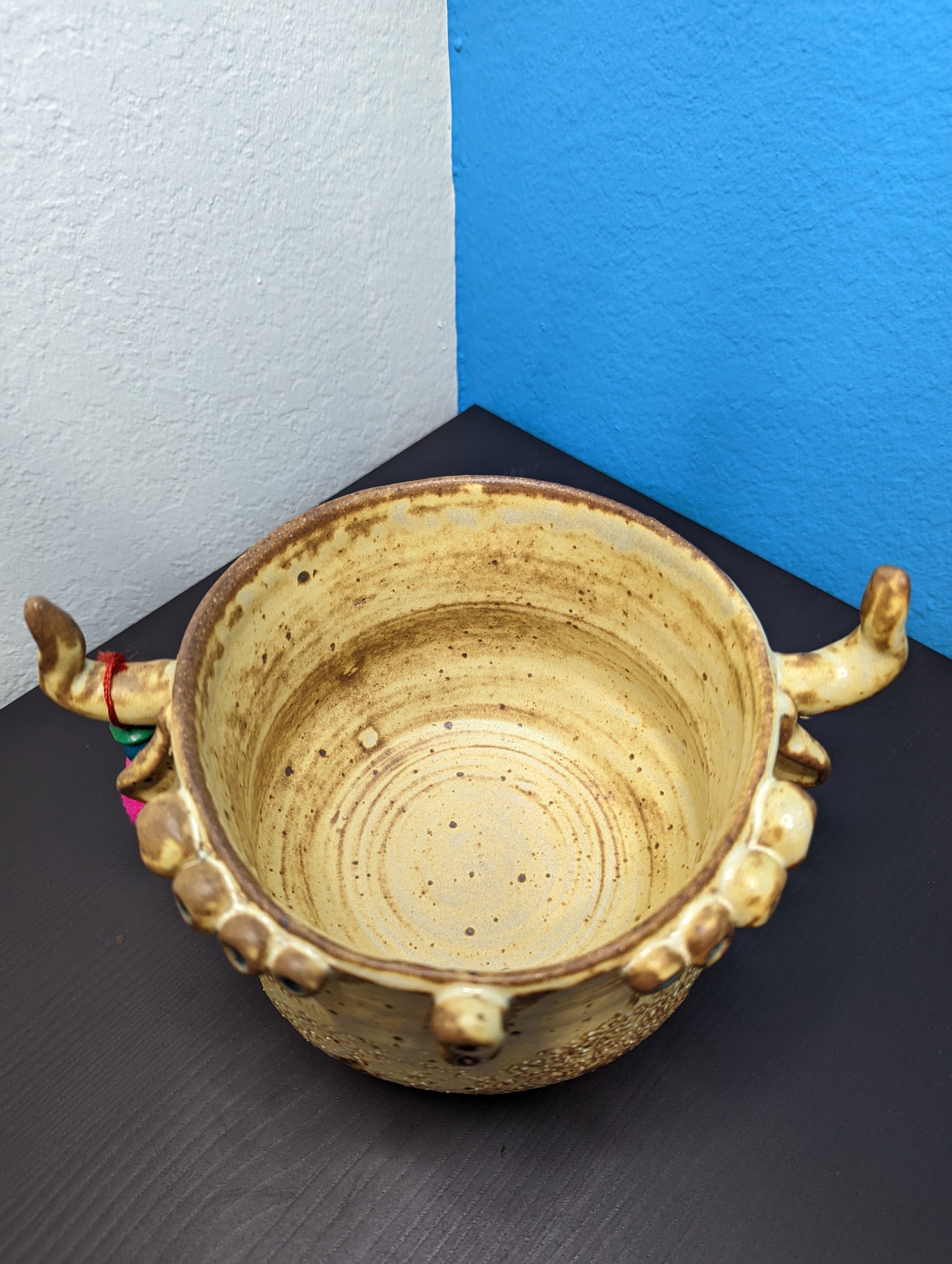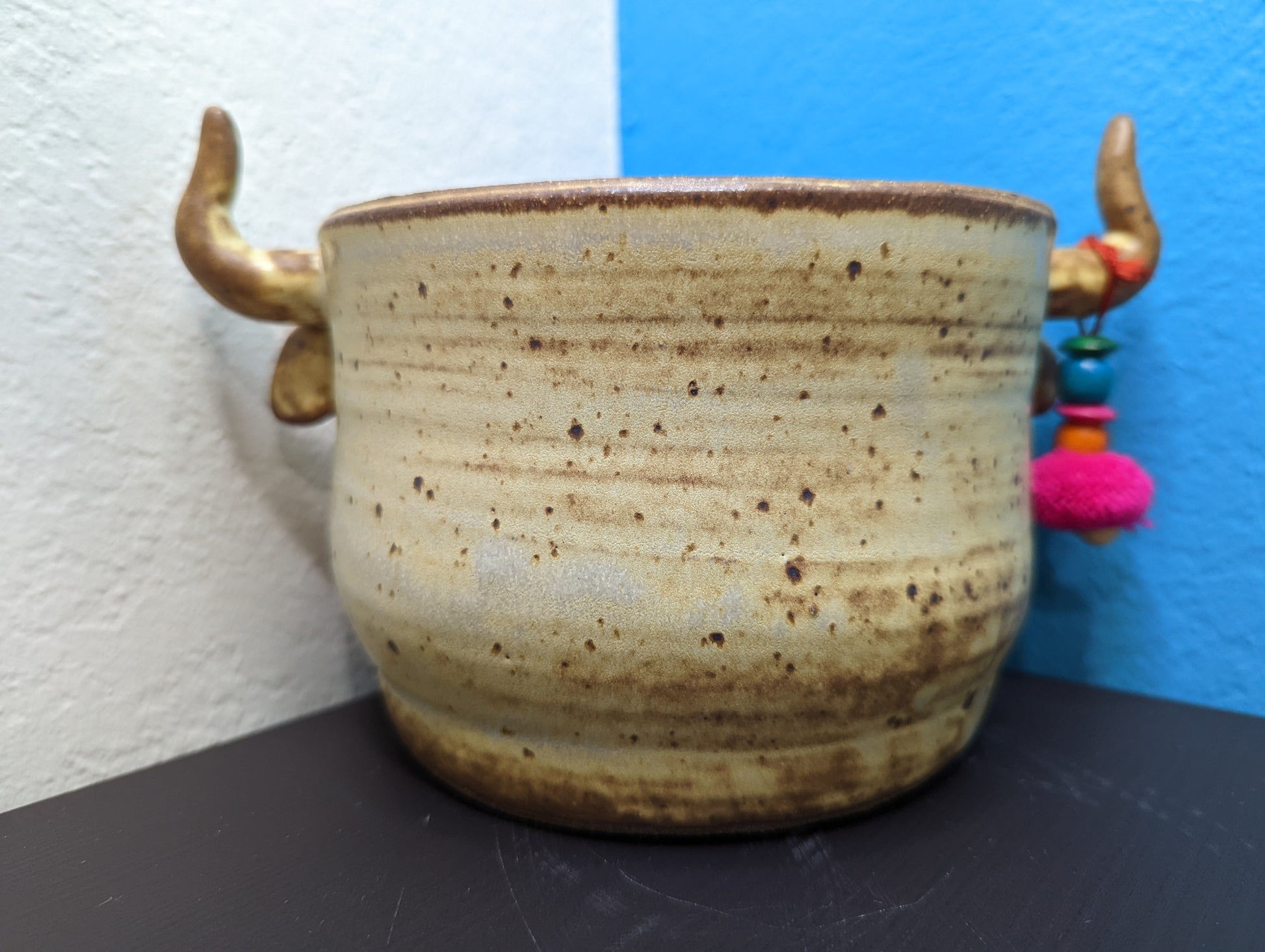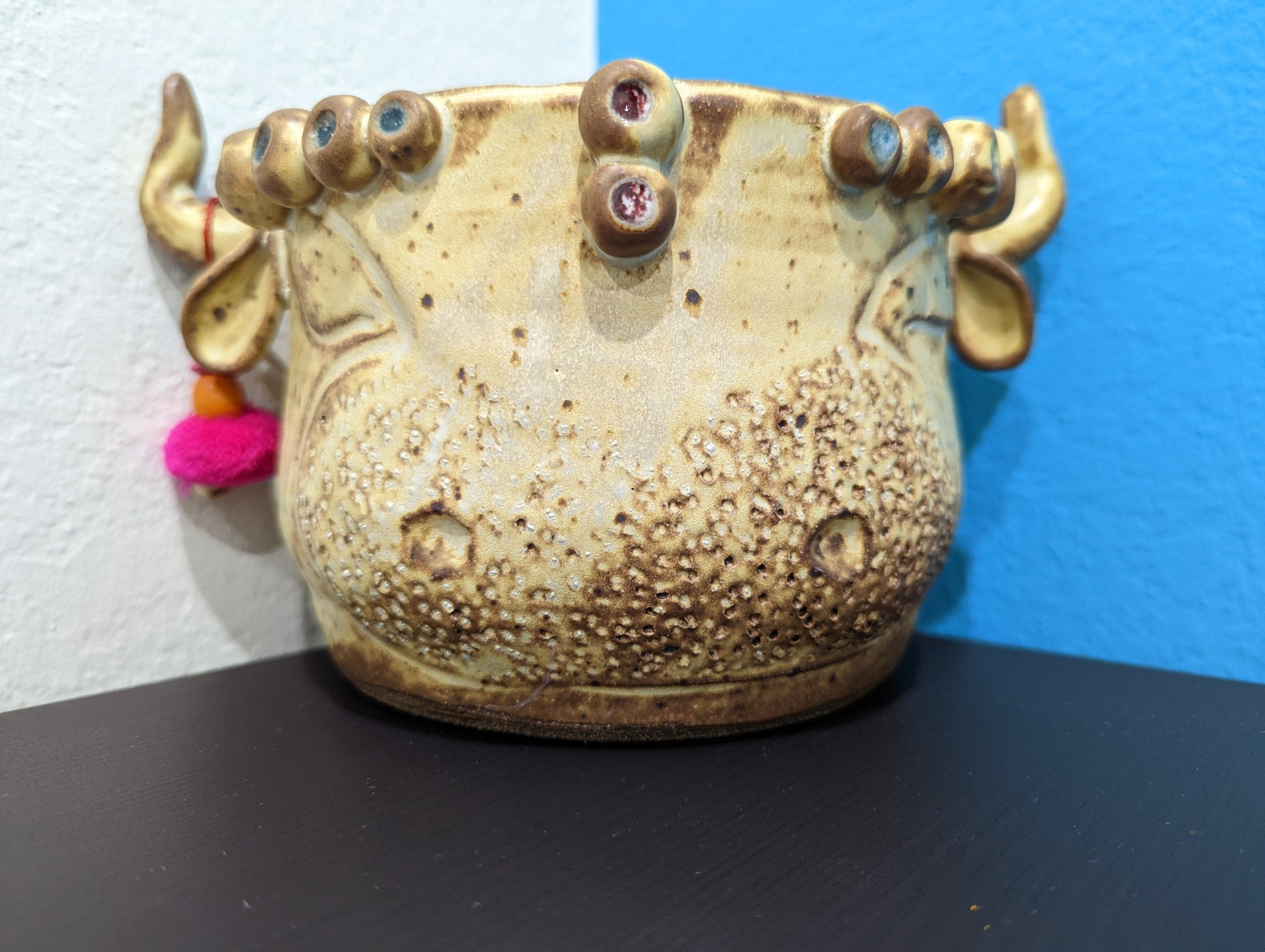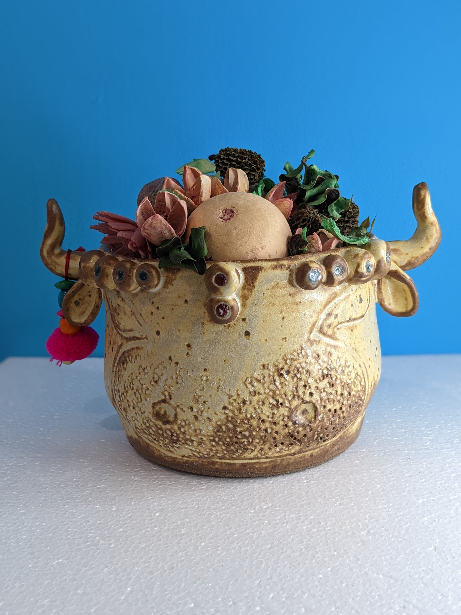 This is Moo, your handmade ceramic art work, crafted with unique design and patterns, drawing you close to Nature. Moo could be used as a decorative bowl for potpourri, or anything you would like on your coffee table. Moo is gracious with a beige tone and adorns a bright pink tassel with colorful wooden beads on its horn.